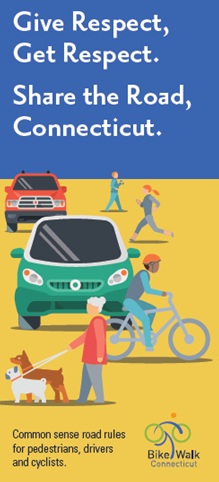 Connecticut’s roads are traveled by walkers, runners, and cyclists who are welcome and expected to use the roads for transportation, fitness, and recreation. With common courtesy, common sense, and respect for the rules to share the road, Connecticut’s roads can be safer for everyone. Please do your part whether you’re driving, cycling, walking, or running. Share the Road rules for pedestrians, cyclists, and drivers are summarized below. Please see the brochure and below for more details.